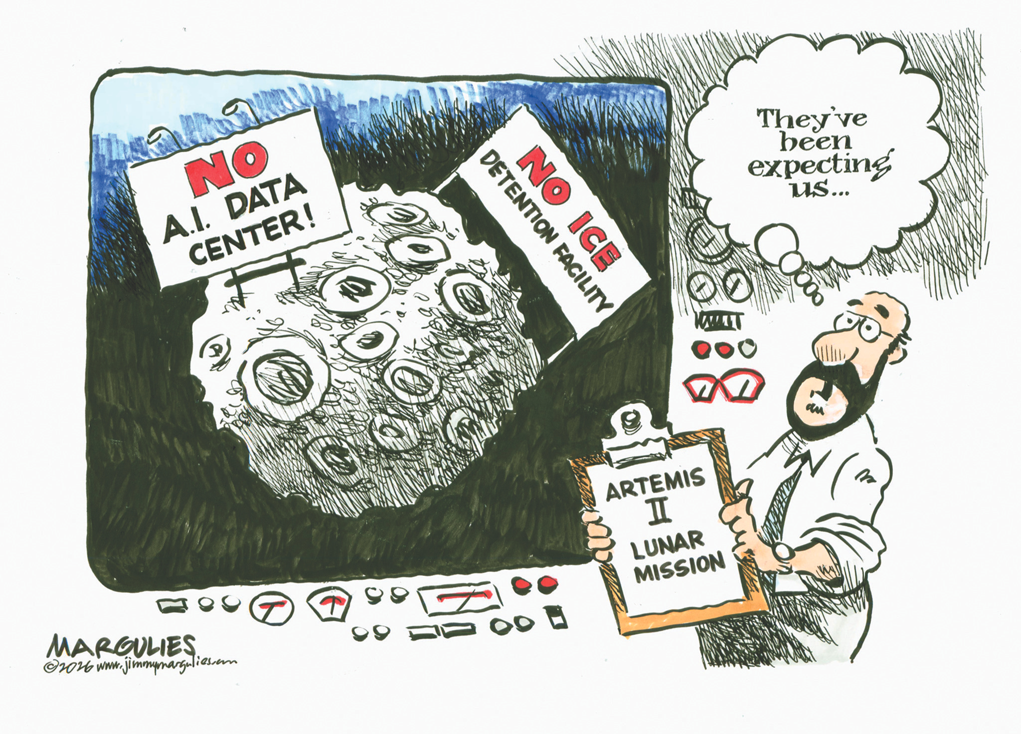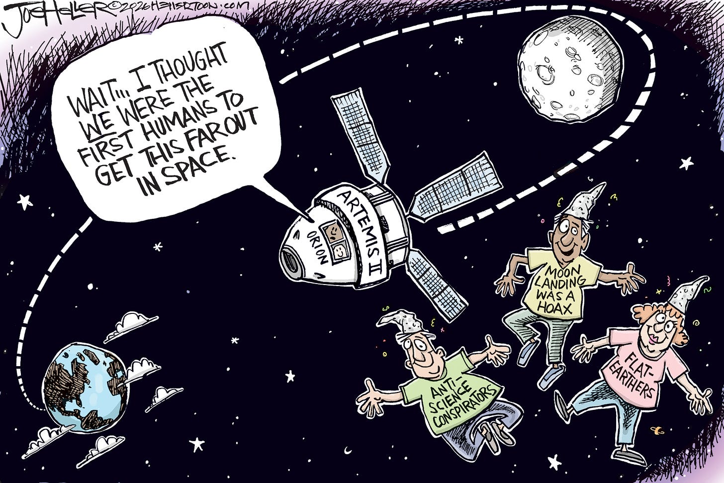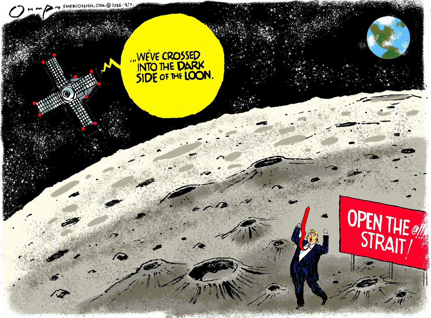 It was a useful reminder that once upon a time this country could point itself toward the heavens instead of spending every waking hour screaming at itself on cable news and Truth Social. Back then, Americans looked up at the moon and thought, “We should go there.” Now, we have a president who habitually moons his critics, the judiciary branch, the Constitution, the Geneva Conventions, NATO, and anyone who notices his bad spray tan.